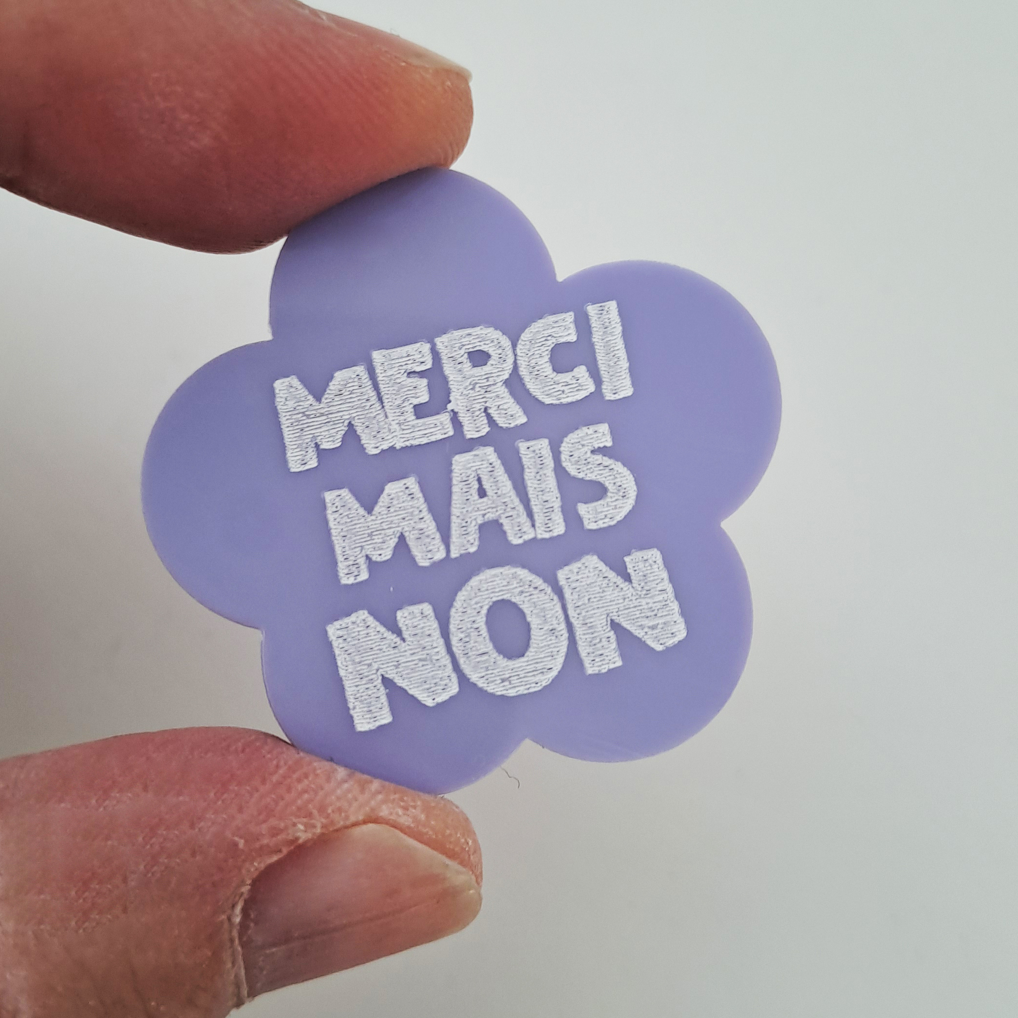 Broche artisanale Merci mais non